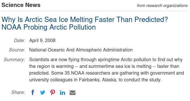 Η διατύπωση ήταν πάντα «οι πάγοι λιώνουν γρηγορότερα απ’ ό,τι είχε προβλεφθεί» ή «λιώνουν γρηγορότερα απ’ ό,τι αναμενόταν». Η ισοδύναμη διατύπωση, «τα κλιματικά μοντέλα έκαναν λάθος προβλέψεις», δεν ακούστηκε.