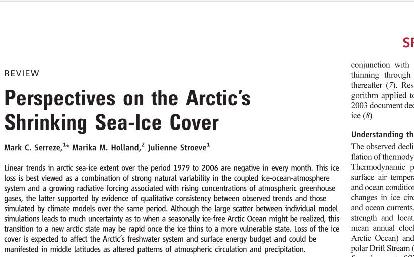 Κάθε καλοκαίρι ο πάγος στην Αρκτική λιώνει, και η επιφάνειά του γίνεται ελάχιστη το Σεπτέμβριο. Κάθε χειμώνα παγώνει, και η επιφάνειά του μεγιστοποιείται το Μάρτιο. Από το 1979 ως το 2006, διαπίστωνε το άρθρο, ο πάγος μειωνόταν, αλλά η έκταση του Σεπτεμβρίου μειωνόταν πιο πολύ. Τα κλιματικά μοντέλα, έλεγαν οι επιστήμονες που συνέγραψαν την εργασία, είχαν προβλέψει ότι όντως η έκταση Σεπτεμβρίου θα είχε μεγαλύτερη μείωση από την έκταση των άλλων μηνών.1
