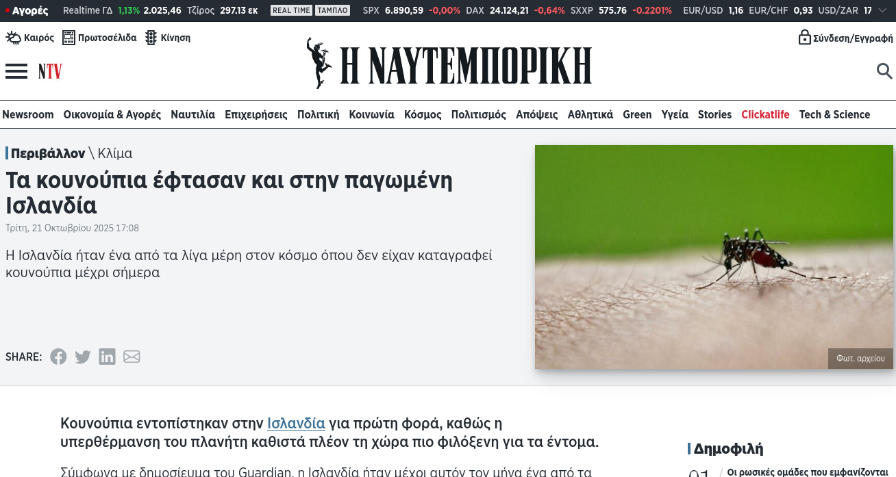 Πρόσφατα κυκλοφόρησε στο διεθνή τύπο η είδηση ότι κουνούπια εμφανίστηκαν για πρώτη φορά στην Ισλανδία, και πως, φυσικά, υπεύθυνη γι’ αυτό είναι η κλιματική αλλαγή. Να μερικά αποσπάσματα από το σχετικό άρθρο της Ναυτεμπορικής: