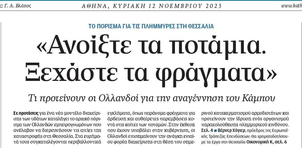 Η Καθημερινή έχει μέρες να αναφέρει την «κλιματική κρίση» στην πρώτη σελίδα, αν και την έχει αναφέρει στις μέσα σελίδες. Θα κάνουμε όμως ένα διάλειμμα και θα ασχοληθούμε με κάτι λίγο διαφορετικό, που ήταν το κύριο πρωτοσέλιδο άρθρο.Οι «Ολλανδοί εμπειρογνώμονες» στους οποίους η κυβέρνηση ανέθεσε τη διερεύνηση των αιτίων της καταστροφής στη Θεσσαλία παρέδωσαν το αρχικό τους πόρισμα.